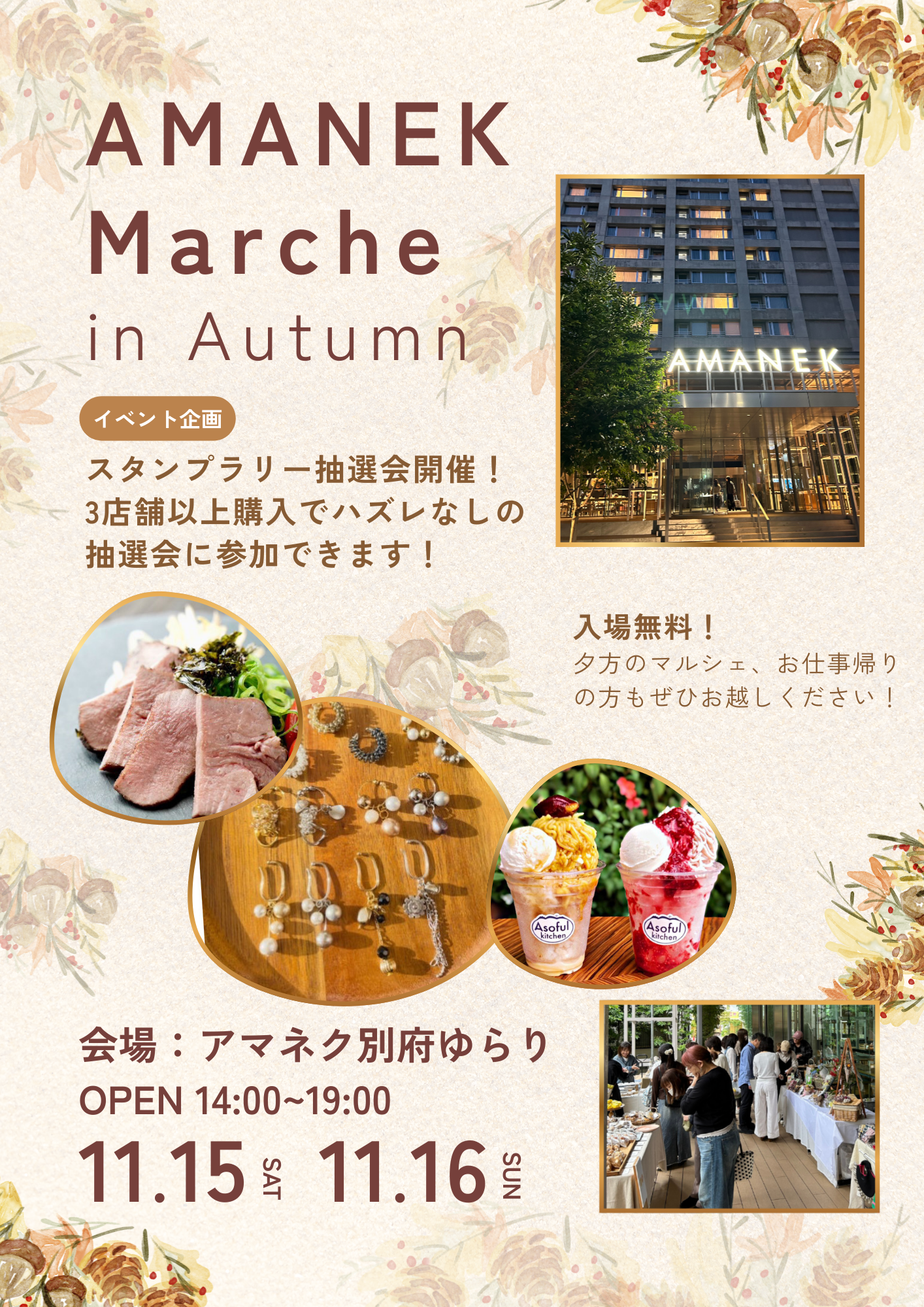 株式会社アマネク(東京都千代田区、代表取締役:安達禎文)が運営する「アマネク別府ゆらり」は、地域活性化ホテルとしての取り組みの一環として、11月15日(土)・16日(日)の2日間、ホテル正面テラスにて「アマネクマルシェ in Autumn」を開催いたします。本イベントは、ホテルに宿泊されるお客様はもちろん、別府を観光中の方・地域住民の方など、どなたでも気軽にご参加いただけます。