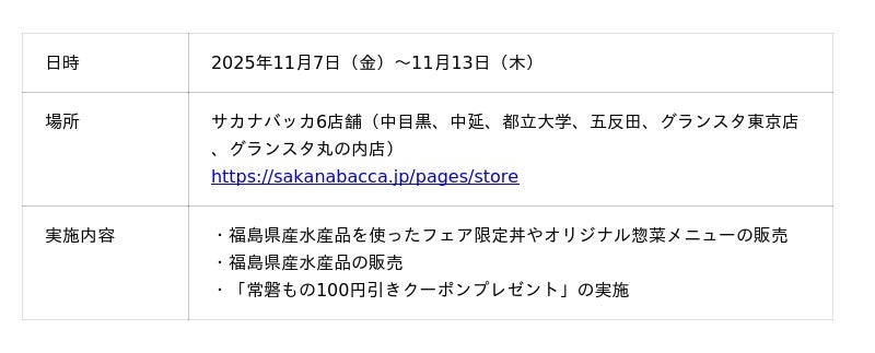 「生鮮流通に新しい循環を」をビジョンに掲げる株式会社フーディソン(本社:東京都中央区、代表取締役CEO山本徹、証券コード:7114、以下 当社)は、2025年11月7日(金)~ 13日(木)の 7日間、東京電力ホールディングス株式会社(以下、東京電力HD)と協業し、当社運営の鮮魚専門店sakana bacca(以下 サカナバッカ)6店舗にて福島県産水産品の美味しさや魅力を発信する「発見!ふくしまフェア」第15弾を開催します。本フェアを通して、多くのお客様に「常磐もの」の美味しさ・魅力をお届けし、福島県産水産品の販売促進を継続して推進すると共に、福島県の復興支援に貢献してまいります。