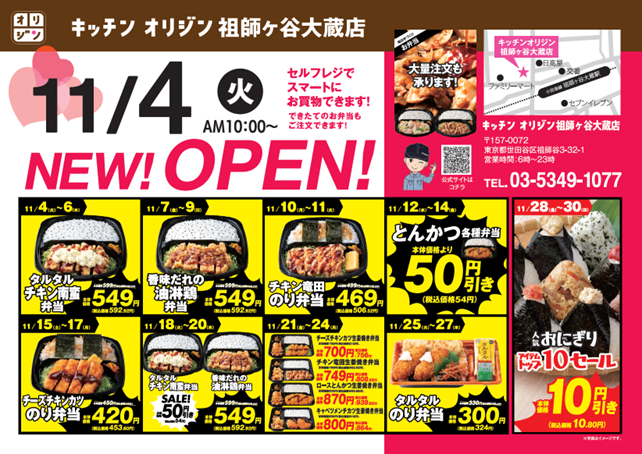 弁当・惣菜専門店「キッチンオリジン」「オリジン弁当」を展開しているイオングループのオリジン東秀株式会社(本社:東京都調布市/代表:後藤 雅之)は、11月4日(火)10時に、キッチンオリジン祖師ヶ谷大蔵店をオープンいたします。