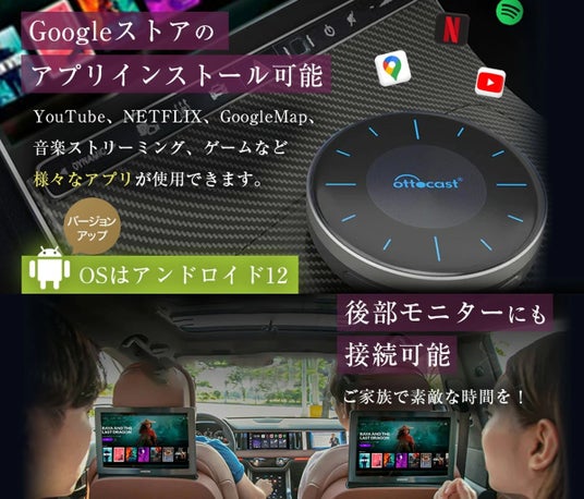 OTTOCASTは、車のカーナビに工事不要で接続し、YouTubeやNetflixなどの動画コンテンツを車内で楽しめる車載用スマートデバイスです。CarPlayやAndroid Autoに対応し、スマートフォンのような操作感で快適なドライブエンターテインメントを実現します。