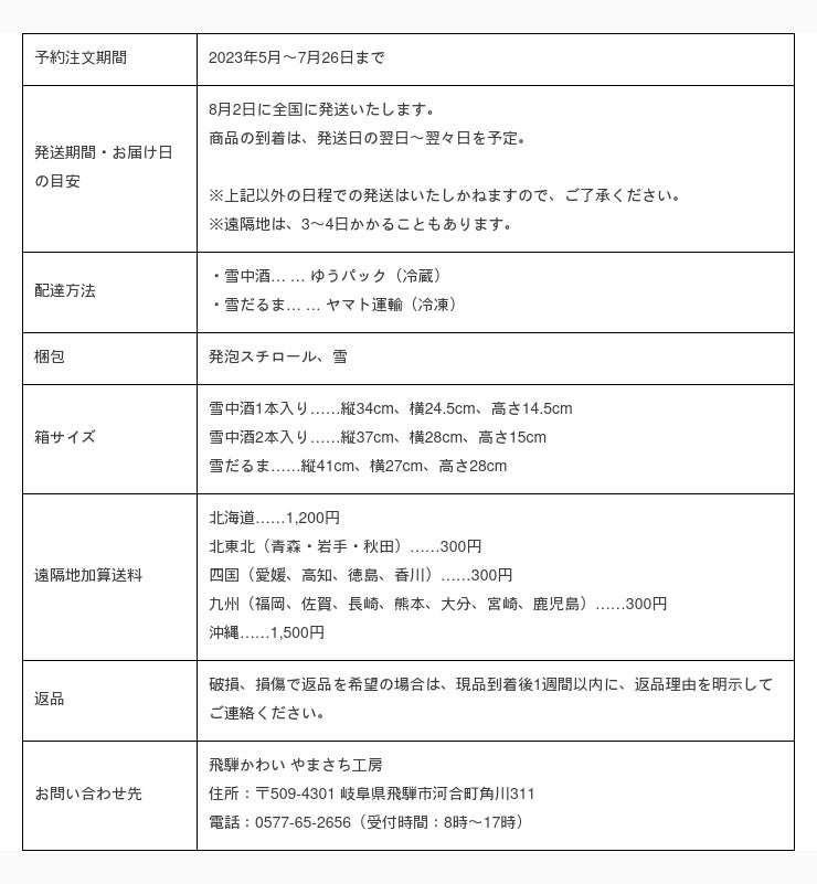 飛騨かわい やまさち工房(運営会社:株式会社飛騨ゆい、代表取締役社長:中畑広一)は、天然雪と一緒に夏に届ける日本酒「飛騨かわい 雪中酒」を、2023年7月5日より発送開始しました。雪室で100日近く冷却し熟成させた生酒です。雪中酒は、7月26日まで、公式サイトや電話で注文受付中です(限定4,000本)。