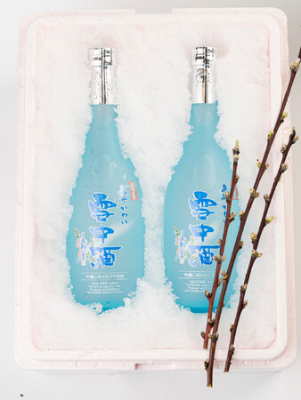 雪中酒作りは、1月に、地元「天生山(あもうさん)」の湧き水を採取するところから始まります。2月には4,000本以上の日本酒を保管できる雪室を作成。3月上旬には、しぼりたて生酒を約0℃の雪室におさめます。約3ヶ月(100日ほど)冷却して熟成させた後、7月の暑中に、冷却雪とともに全国へ出荷します。
