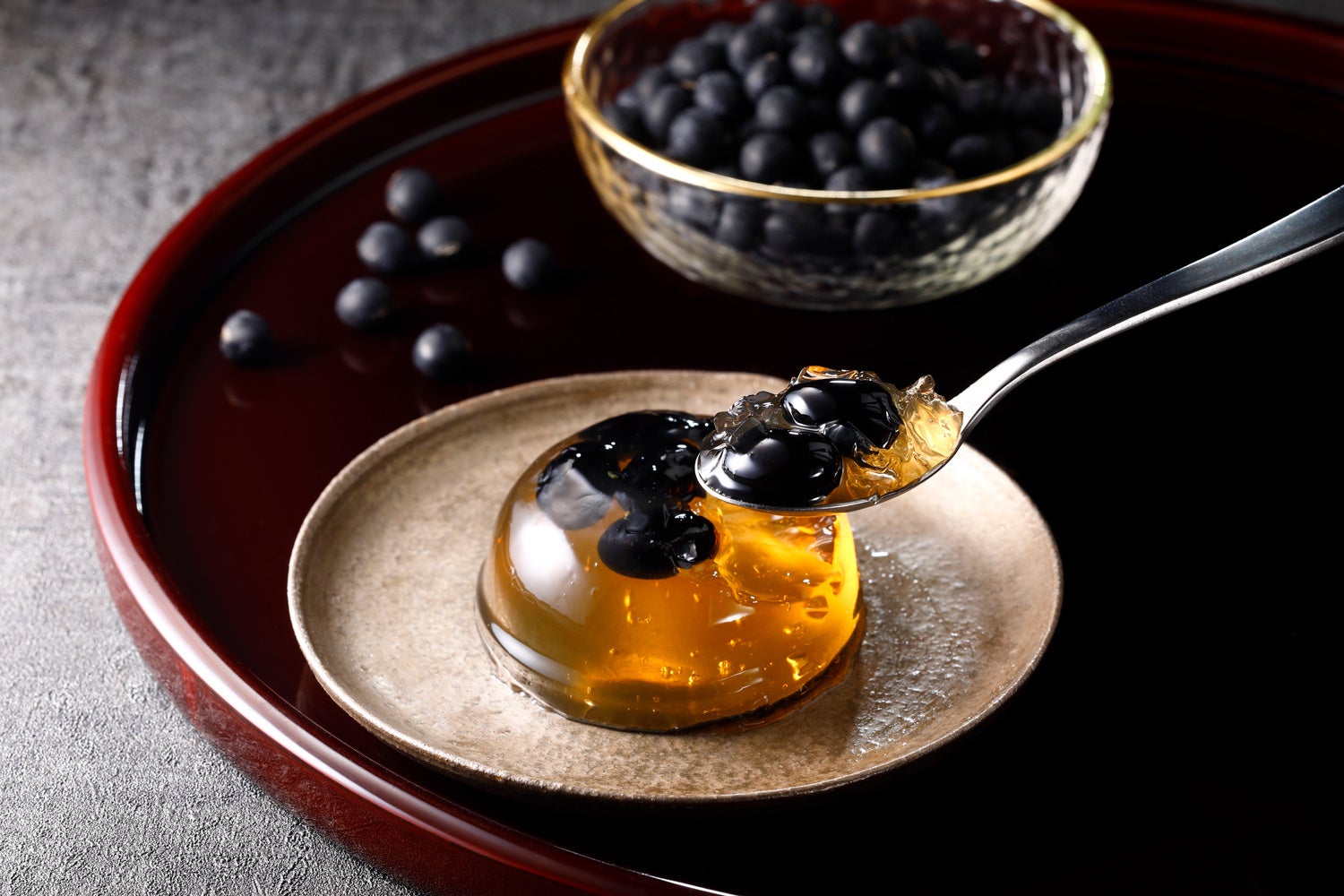 ふっくら柔らかなどらまめの甘煮を錦玉羹の中に入れました。