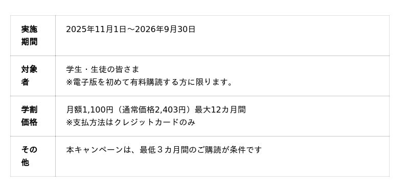 日本農業新聞(本社:東京都台東区、代表取締役社長:田宮和史郎)は、学生・生徒の皆さんを対象に、「日本農業新聞電子版」を月額1,100円(通常価格2,403円)で購読できるキャンペーンを11月から始めました。ぜひこの機会に、日本農業新聞電子版をお得にご活用ください。