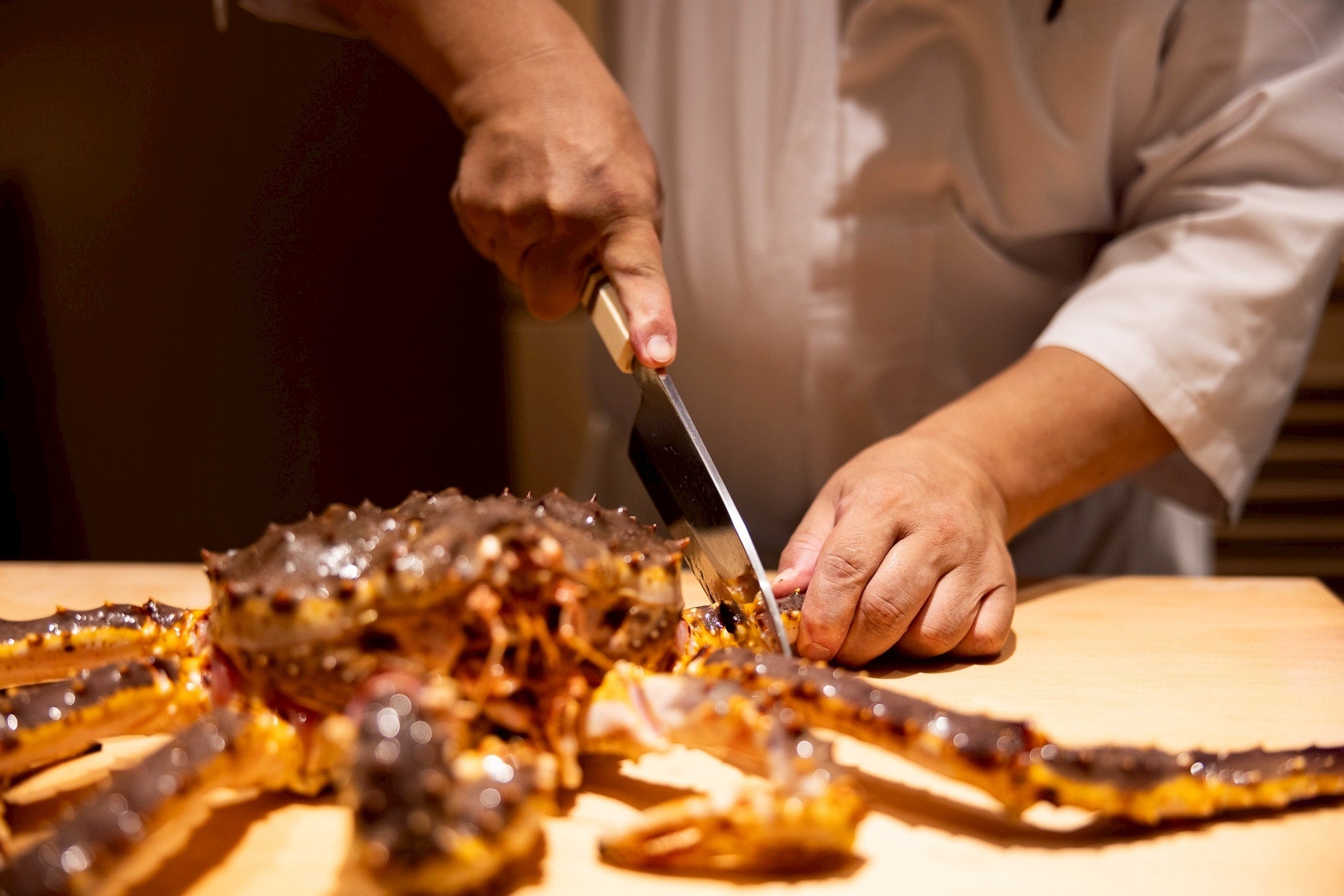 なかなか見ることのできない蟹調理の、豪快かつ繊細な包丁捌きをご堪能ください。