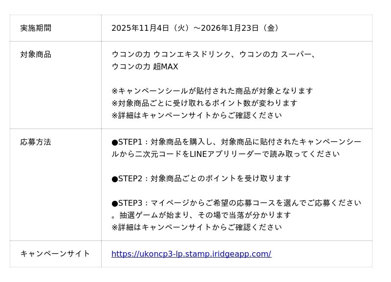 株式会社アイリッジ(本社:東京都港区、代表取締役社長:小田 健太郎、東京証券取引所グロース:3917、以下「アイリッジ」)とアイリッジの連結子会社でマーケティングに関するコミュニケーションデザイン事業を展開する株式会社Qoil(読み:コイル、本社:東京都港区、代表取締役社長:山下 紘史、以下「Qoil」)は、両社が提供するLINEを活用した販促・顧客育成ツール「LINKFUN」が、ハウスウェルネスフーズ株式会社(本社:兵庫県伊丹市、代表取締役社長:倉田 千裕、以下「ハウスウェルネスフーズ」)に採用され、2025年11月4日より「飲んで、笑って、ウコンの力でトクするキャンペーン」が開始されることをお知らせします。