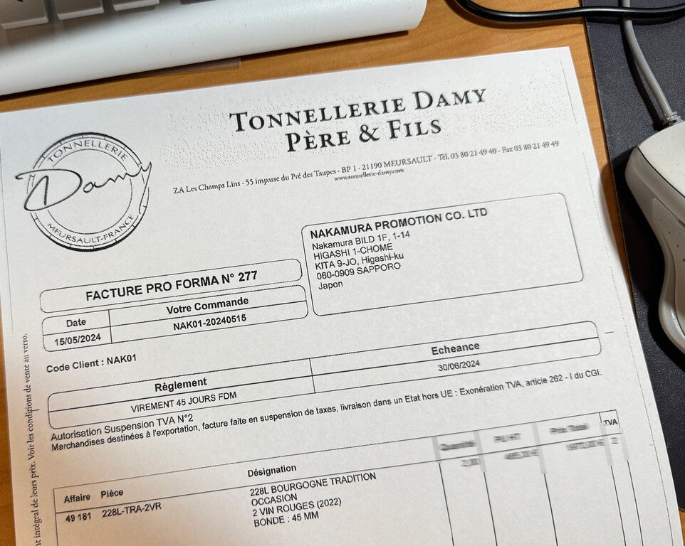 Tonnellrie Damy 228L Bourgogne 2022 1空きの樽 2樽 インボイス Facture