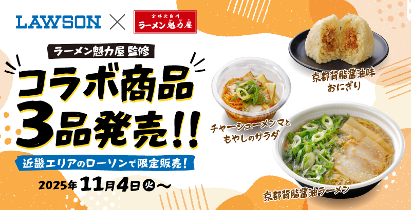 京都北白川ラーメン魁力屋をチェーン展開する株式会社魁力屋(https://corp.kairikiya.co.jp/ 本社:京都市中京区、代表取締役社長:藤田 宗、以下魁力屋)は株式会社ローソン(https://www.lawson.co.jp/本社:東京都品川区、代表取締役社長:竹増貞信、以下ローソン)と、両社のコラボ商品として、「京都背脂醤油ラーメン」「京都背脂醤油味 おにぎり」など計3品を共同開発いたしました。