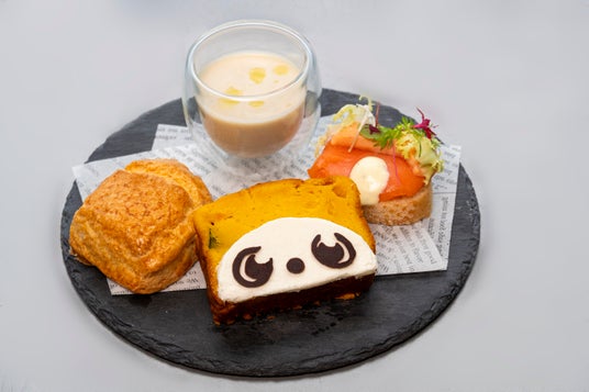 そんな心和むアフタヌーンティータイムをさらにお楽しみいただけるよう、取り皿には、チョコスプレーで描かれたLOVOTのシルエットを描いたプレートをご用意。デザートスタンドには、LOVOTの愛らしい丸い瞳をモチーフとしたパウンドケーキを添え、遊び心あふれるスイーツとともにやさしいひとときを演出します。
