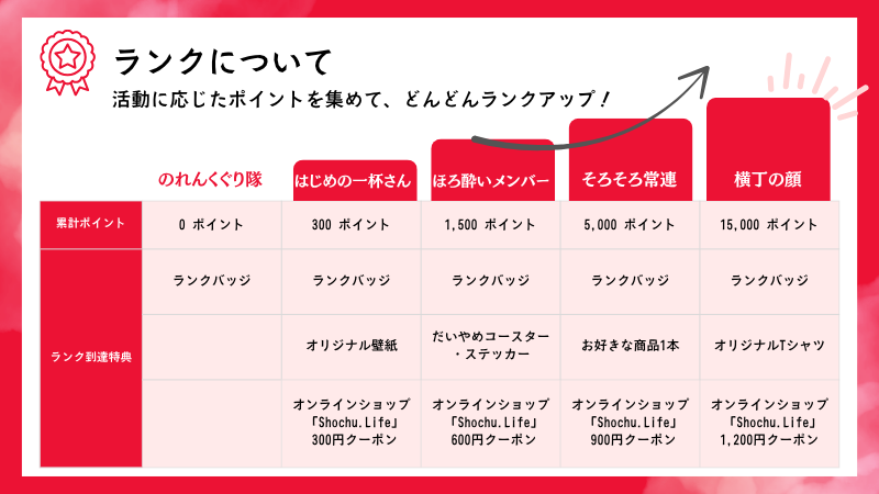 ログイン・投稿・コメント・いいねなどの活動に応じ、付与されるポイントを集めると「のれんくぐり隊」→「はじめの一杯さん」→「ほろ酔いメンバー」→「そろそろ常連」→「横丁の顔」とランクアップ。ランクが上がるごとに、ランクバッジやノベルティ、公式オンラインショップ「Shochu.Life」で使えるクーポンをプレゼントします。