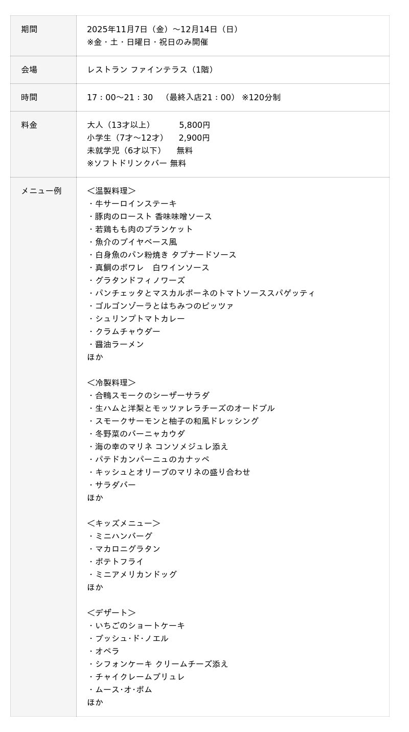 舞浜ビューホテル by HULIC(所在地:千葉県浦安市、総支配人:鈴木裕樹、運営:ヒューリックホテルマネジメント株式会社)では、1階「レストラン ファインテラス」にて、季節限定の「冬のごちそうディナービュッフェ」を開催いたします。開催日は11月7日(金)~12月14日(日)の金・土・日曜日・祝日のみ。冬の夜にぴったりのあたたかな料理とスイーツを取り揃え、ご家族やご友人、大切な方と過ごす特別なひとときを演出いたします。