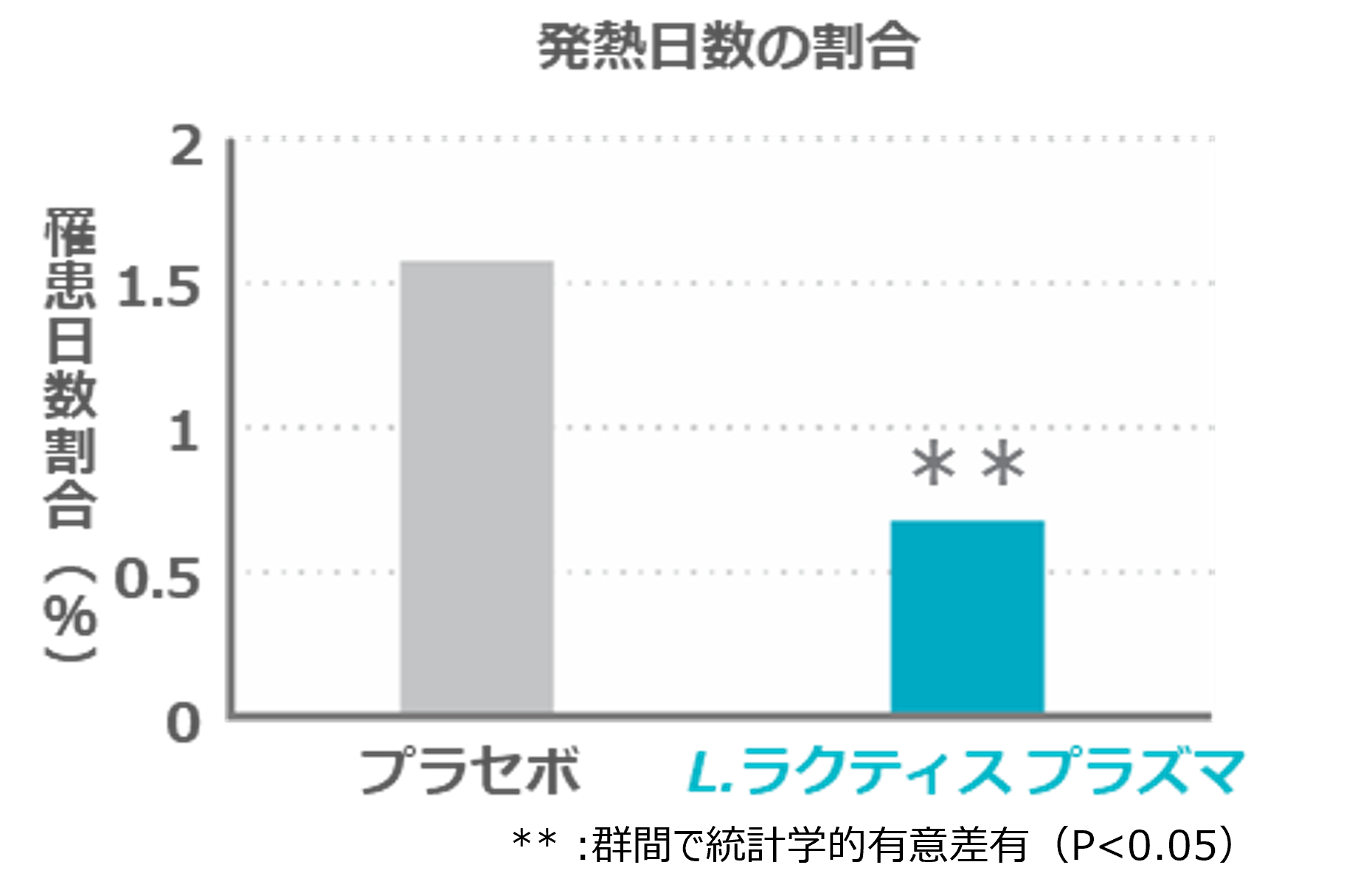 医学生101名をL.ラクティス プラズマ摂取群52名とプラセボ群49名に分け、4週間の摂取を継続し、症状や血中の免疫応答を比較しました。その結果、L.ラクティス プラズマを摂取した群では、プラセボ群に比べて発熱や倦怠感を感じた日数の割合が有意に少ないことが示されました。