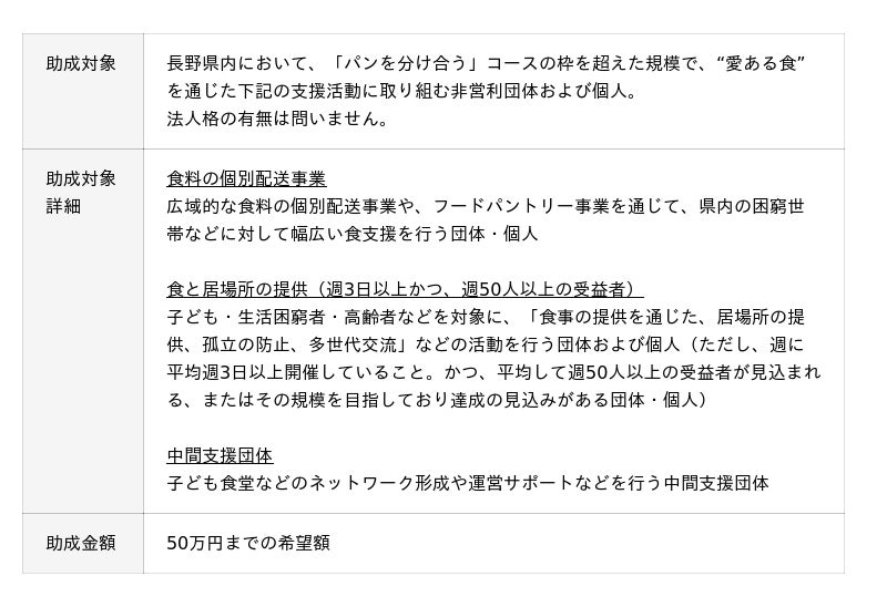 今回実施する助成事業は、財団設立後2回目の取り組みとなります。“愛ある食”による支援を通じて、ただお腹を満たすだけでなく、心にも温かさを届ける活動に取り組む団体および個人を対象としております。