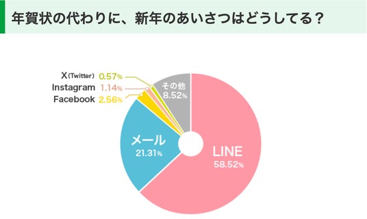 新年のあいさつ手段として最も多かったのは「LINE」。続いて「メール」が続きました。やはりLINEが圧倒的で、気軽にタイムリーに送れることから、“デジタル年賀”の定番ツールとなっています。
