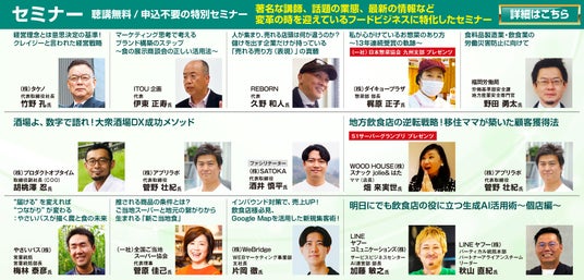 『竹乃屋』などの飲食店を展開する株式会社タケノ 竹野 孔 氏をはじめ、食業界をけん引する著名な講師が登壇いたします。またLINEヤフーコミュニケーションズ株式会社 加藤 敏之 氏×LINEヤフー株式会社 秋山 直紀 氏による飲食店の役に立つ“生成AI”活用に関するセミナーも実施いたします!ここでしか聞けない貴重な【無料】セミナーをお見逃しなく!