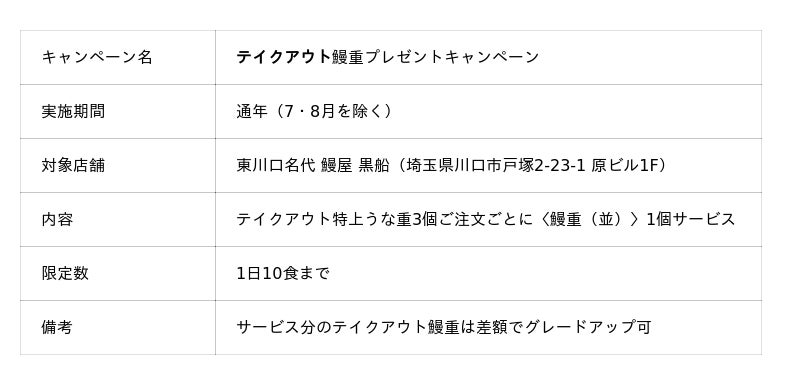 埼玉県・東川口駅すぐの「東川口名代 鰻屋 黒船」では、日頃のお客さまのご愛顧への感謝を込めて、七・八月を除く期間中、特別キャンペーン!テイクアウト限定「サービス鰻重」を実施いたします。