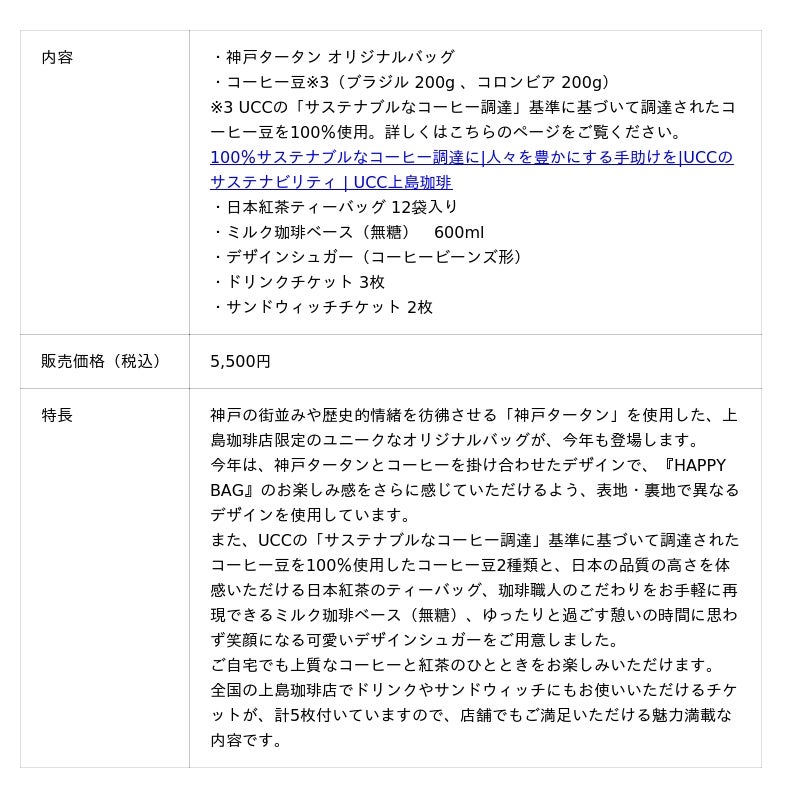 上島珈琲店では、上島珈琲店の魅力である「こだわり」「丁寧さ」「上質さ」をコンセプトとしたお得な福袋『HAPPY BAG 2026』を、価格帯別(5,500円、10,000円)で2種類ご用意しました。UCC創業の地・神戸を象徴する「神戸タータン※1」を使用したオリジナルバッグをはじめ、コーヒー豆や、日本紅茶※2、ドリンクチケット、サンドウィッチチケットなど、慌ただしい日常を忘れ、自分らしく上質なひとときをお過ごしいただけるようなアイテムをお届けします。