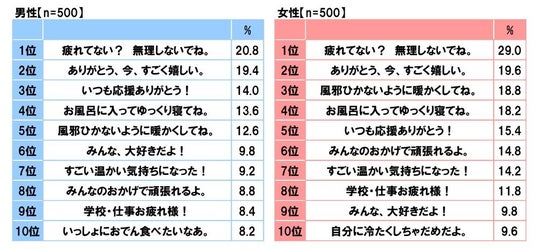 男女別にみると、男女ともに1位「疲れてない? 無理しないでね。」、2位「ありがとう、今、すごく嬉しい。」となり、男性では3位「いつも応援ありがとう!」、女性では3位「風邪ひかないように暖かくしてね。」でした。
