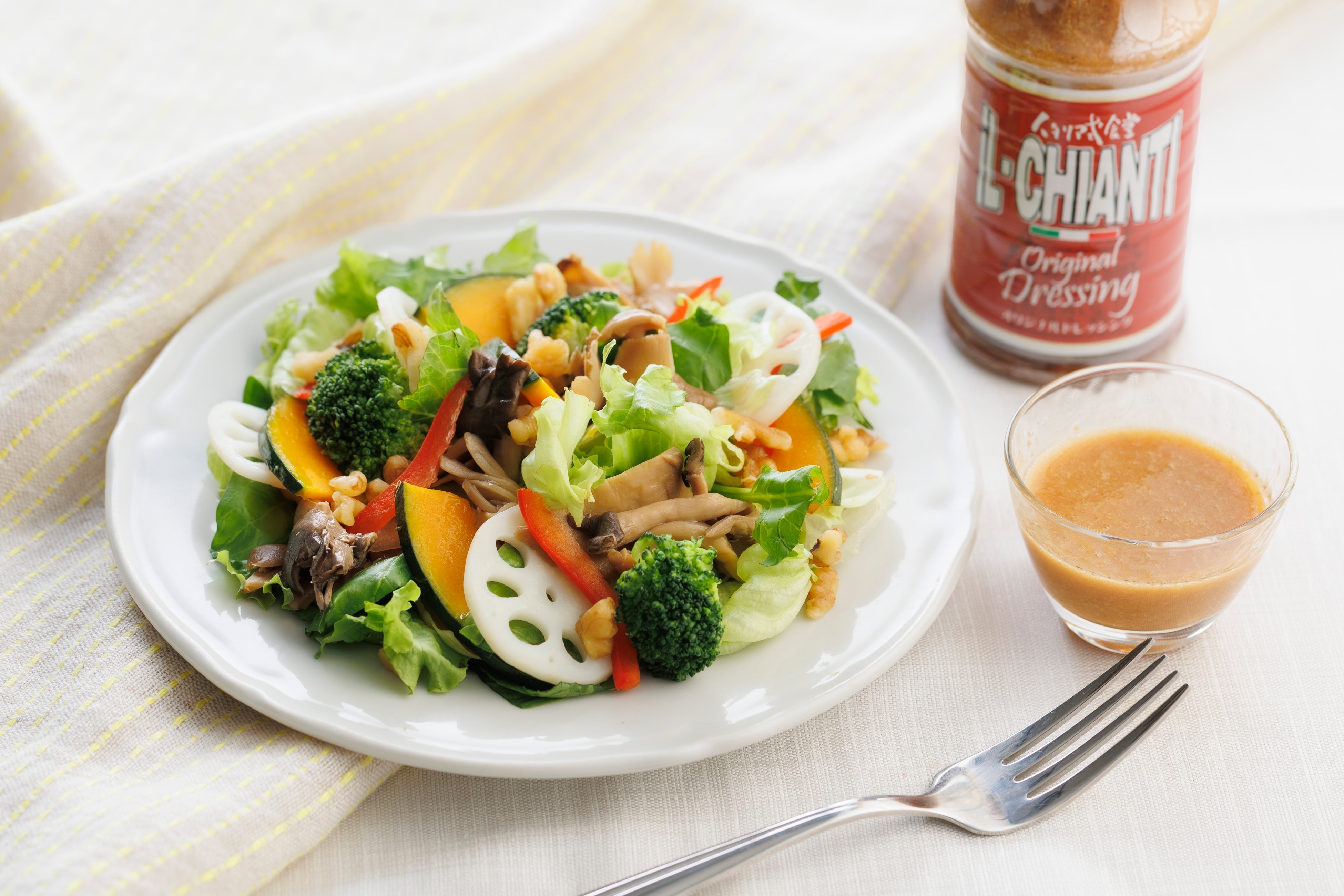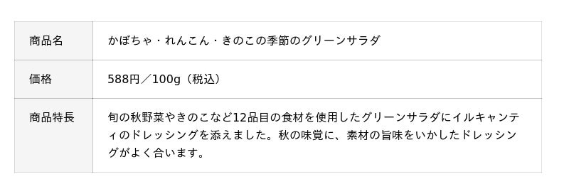 『海老と彩り野菜のスパゲティサラダ~イルキャンティドレッシング仕立て~』は、大きめの海老、トマトや紫キャベツなどの彩り野菜とスパゲティをイルキャンティのオリジナルドレッシングで味付けし、フライドガーリックをトッピングしました。野菜の旨味を存分に楽しめる冷製パスタです。『かぼちゃ・れんこん・きのこの季節のグリーンサラダ』は、サラダカフェでは定番の季節の野菜を使ったサラダに、イルキャンティのドレッシングを添えました。旬の秋野菜と4種のきのこを中心に12品目の食材を使用。秋の味覚に素材の旨味をいかしたドレッシングがよく合うグリーンサラダです。どちらも、サラダカフェの持つ、野菜本来の力を引き立たせるサラダづくりのノウハウと、イルキャンティのドレッシングの魅力がかけ合い、野菜の可能性を広げるメニューに仕上がりました。また、商品の販売期間中、サラダカフェの店舗でもイルキャンティのドレッシングの販売を行います。