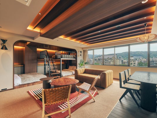 50平方メートル 超のゆったりしたリビングダイニング一体型の広々とした客室で、旅先でも“我が家のような団らん”と、京都に暮らすような滞在をお楽しみください。