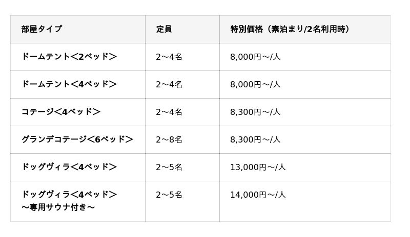 愛犬と泊まれるドッグヴィラをはじめ、快適設備を備えたプライベートコテージや、アウトドア感を存分に楽しめるドームテントなど、多彩な宿泊スタイルの中から、理想のアウトドアステイをお選びいただけます。