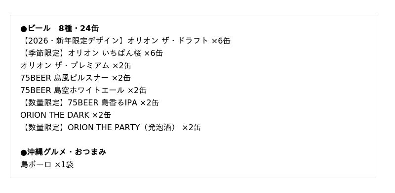 今年のオリオンの福袋は、「2025年の締めくくりと2026年の嘉例を祈願して乾杯!」をテーマに作成しました。来年2026年の干支・午が嘉例(開運)を運ぶ「ザ・ドラフト 2026干支デザイン缶(公式通販限定)」や、沖縄の冬の風物詩「オリオン いちばん桜(季節限定)」、シャンパンのような新感覚テイストの「オリオン ザ パーティー(数量限定)」など、計8種類のバラエティ豊かなオリオンビールの飲み比べがお楽しみいただけます。