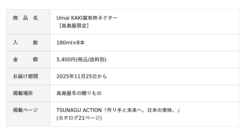 岐阜発の柿ブランド『Umai KAKI』を展開するUmai Japan株式会社(本社:名古屋市昭和区、代表取締役:杉本稜太、以下「Umai Japan」)は、同ブランドの『Umai KAKI富有柿ネクター』が株式会社高島屋(以下「高島屋」)の『2025 高島屋 冬の贈りもの』に採用・掲載いただいたことをお知らせします。