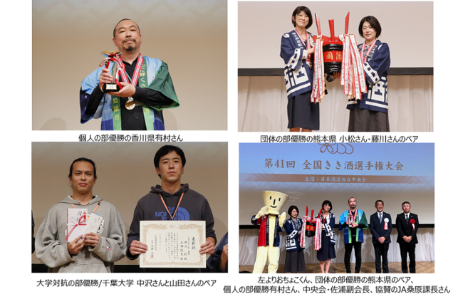 きき酒選手権大会は、日本酒の魅力や文化を幅広く知ってもらうことを目的に、1981年より開催され、今年で41回目となる歴史のある大会。今年は32都道府県の代表選手、計66名が参加する「個人の部」と各都道府県の代表2名の合計点で競い合う「団体の部」が、それぞれアマチュアきき酒日本一の座をかけて競い合いました。「個人の部」優勝は香川県代表として初優勝となった有村和彦(ありむら かずひこ)さんが、見事アマチュアのきき酒日本一に輝きました。有村さんは「嬉しいです!今後も日本酒を飲み続けます」と満面の笑みを浮かべていました。一方「団体の部」は、小松 益美 (こまつ ますみ) さんと藤川 美奈子 (ふじかわ みなこ)さん女性ペアのお二人で、熊本県としては初の優勝となりました。小松さんは 「熊本県にとっては初めての優勝なので感無量です! 」と喜びを噛みしめていました。