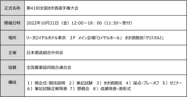全国約1,700の酒類(日本酒、本格焼酎・泡盛、本みりん)メーカーが所属する日本酒業界最大の団体である日本酒造組合中央会(以下、中央会)では、40年以上の歴史を積んできたアマチュアのきき酒日本一を決める『第41回全国きき酒選手権大会』(以下、きき酒選手権大会)を10月21日(金)にリーガローヤルホテル東京で開催しました。