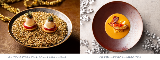 山わさびをアクセントにしたボルシチ風の真鯛の香草バター焼きは、真鯛の白、香草バターの緑、ボルシチの赤、仕上げに山わさびの雪が舞い一皿の上にクリスマスを表現した一品。オマール海老のビスクは、ご馳走の代表格であるオマール海老を丸ごと使用した濃厚なビスクに、肉厚なオマール海老のテールを香ばしくソテーして添えています。