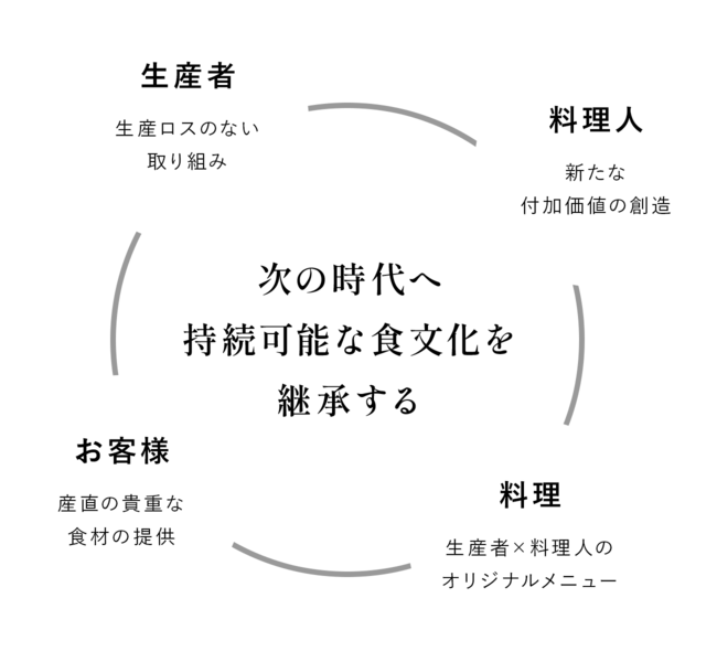 日本の食文化の価値を高めるべく、新しい発想を取り入れながら料理人の職人技に磨きをかけ、サステナブルな食の新しいあり方を追求し、社会問題解決に取り組んで参ります。