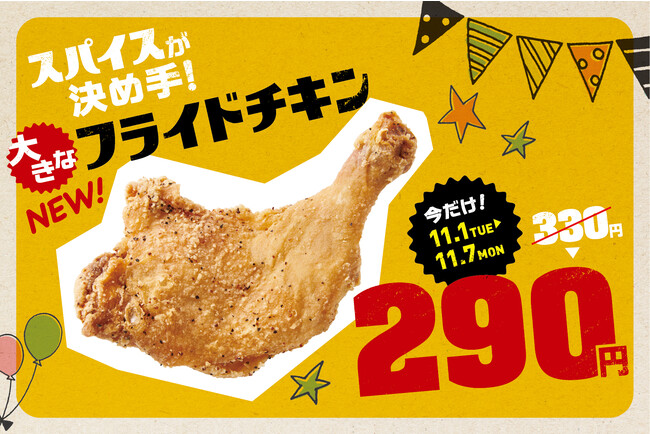 自慢のチキンをより多くの方に味わっていただきたいという思いから、新発売の『骨付きフライドチキン』をお得にお楽しみいただけるキャンペーンを、11月1日(火)~11月7日(月)の1週間限定で実施いたします。こだわりのチキンをぜひこの機会にお試しください。