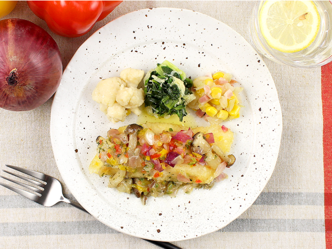 ふっくらと揚げた白身魚と、出汁のきいたアクアパッツァソースをプレートにまとめました。きのことアサリが味に深みをもたせます。トッピングに赤たまねぎとパプリカを添えておりますので食感の違いをお楽しみ下さい。
