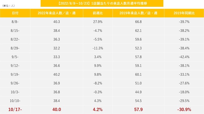 2022年8月8日から10月23日までの1店舗当たりの来店人数週平均と2019年同期比の推移を示した表