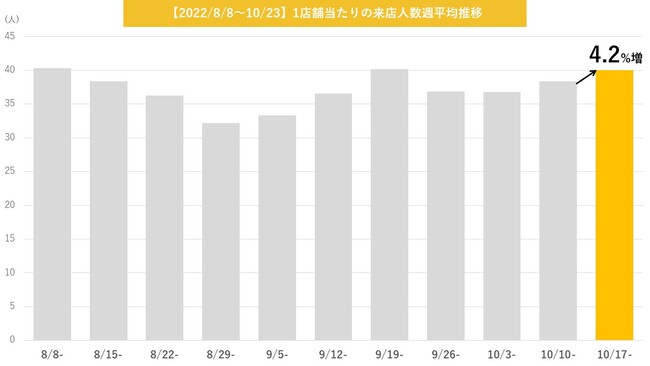 2022年8月8日から10月23日までの1店舗あたりの来店人数週平均推移
