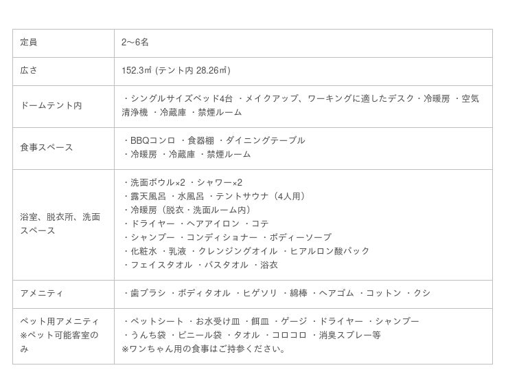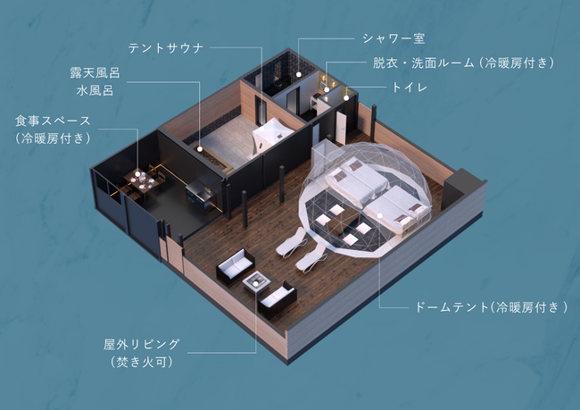 各室をそれぞれ敷居で囲い、プライベート性を重視したスペースの中に独立型のドーム型テントとハウス、露天風呂、テントサウナ、富士山の天然水を使用した水風呂を各室に設置。全天候型プライベート空間を実現しています。