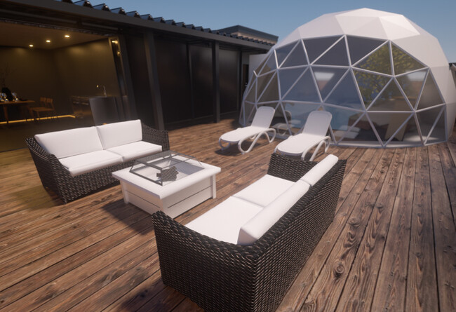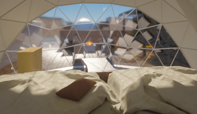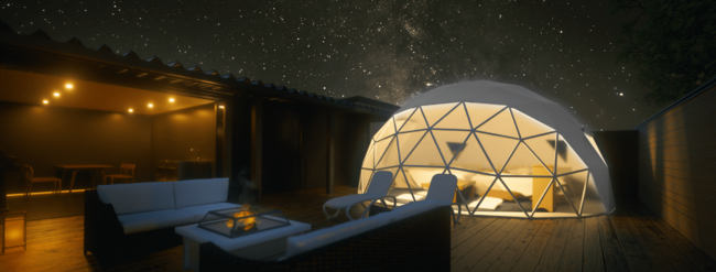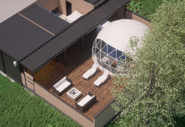 プライベート性を重視した独立型のドーム型テントとハウスの組み合わせで一つの全天候型プライベート空間を実現。