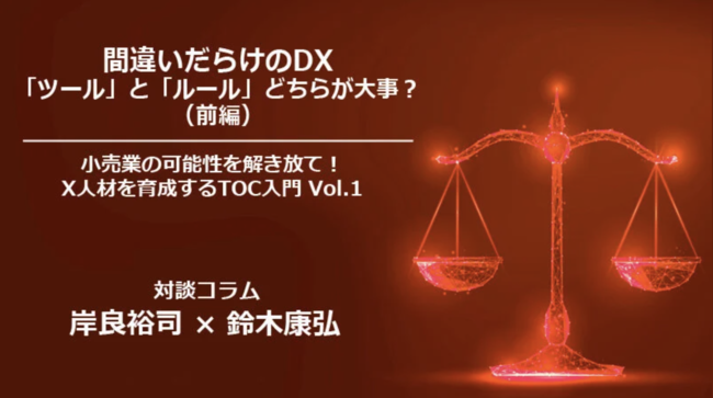 『DXマガジン』において、デジタルシフトウェーブ代表取締役社長の鈴木康弘氏(元セブン&アイ・ホールディングス CIO)と弊社CEOの岸良祐司がDXの本質を議論する「小売業の可能性を解き放て! X人材を育成するTOC入門」と題した連載が10月12日から始まりました。