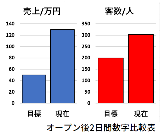 オープン後2日間の「現在」と、「目標」の2日分の売上と客数の比較はグラフの通りで、目標を大きく上回る数字となっております。