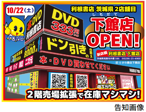 9月23日にオープンした茨城発店舗の利根書店古河店の成功要因である告知活動を、下館店でも25店舗全店とHPなどで約6万人のお客様に行いました。下館店のオープン日も関東を中心に県外から多くのお客様が開店前から来店し賑わいました。