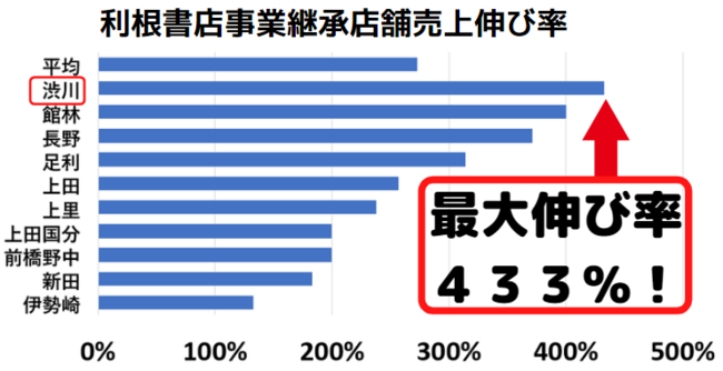 売上の伸び率は買収前から平均すると273%と非常に好調です。最大の伸び率は433%と大きく伸びております。2022年中に3店舗、2023年に6店舗を順次「利根書店」にリニューアル予定で、5年後に9店舗で年商10億円を目標とします。