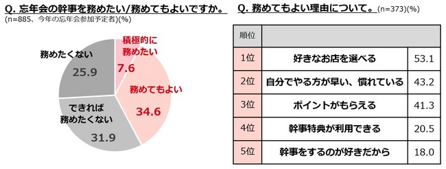 忘年会の幹事について、務めたい・務めても良いを合わせて42.2%となりました。その理由は「好きなお店が選べる」「自分でやる方が早い」「ポイントがもらえる」が上位となっています。一方で、務めたくないと回答した方でも、ポイントがもらえるとしたら38.8%が幹事を務めたい・務めてもよいと回答しました。