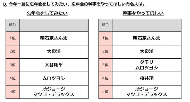一緒に忘年会をしたい有名人も、忘年会の幹事をやってほしい有名人もどちらも1位は明石家さんま。