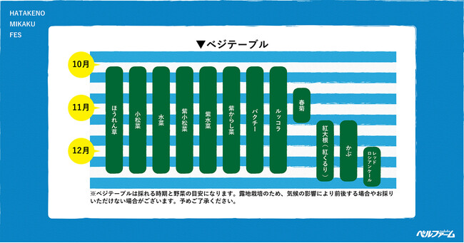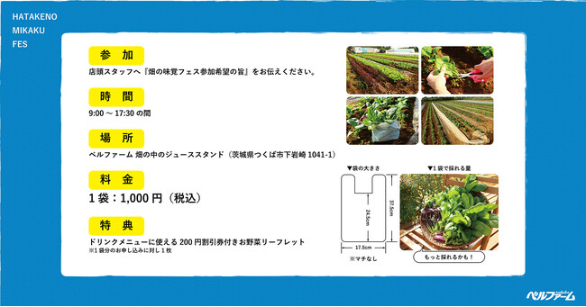 株式会社ベルファームは茨城県つくば市郊外(牛久沼のほとり)に有機農場・冷凍飲料製造工場・ジューススタンドを併設しています。1次産業(生産)、2次産業(加工)、3次産業(販売)を同所で完結させており、ジューススタンドで青汁を飲みながら原料であるケール畑を眺めることができるといったトレーサビリティーの観点からもとても斬新な場所となっています。その環境を活かし、2022年10月22日(土)からジューススタンドテラス席前の畑にて予約不要の有機野菜収穫体験イベント「畑の味覚フェス」を開催中。土や自然に触れながら収穫し、お渡しした袋に入る分だけお持ち帰りいただけます。