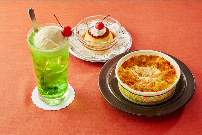 その他にも、さくらんぼを添えた「メロンクリームソーダ」 399円(税込438円)や、軽食メニュー「海老グラタン」 499円(税込548円)や、「ビーフシチュードリア」 599円(税込658円)もご用意しているのでデザートと一緒にお楽しみいただけます!!