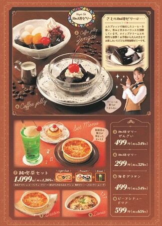 「珈琲ゼリー」299円(税込328円)と「珈琲ゼリーぜんざい」499円(税込548円)、「純喫茶の珈琲ゼリーパフェ」699円(税込768円)の3商品を今回販売します。