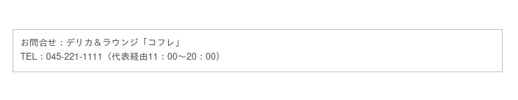 店 舗:1階 デリカ&ラウンジ「コフレ」(11:00~20:00)