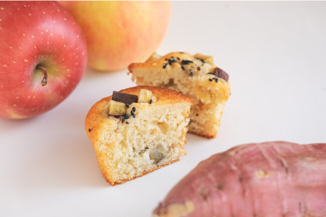 よりしっとり感をプラスするためにすりおろしりんごを入れています。さつまいもだけでなくりんごの食感と存在感も楽しめるようにセミドライりんごを刻んで加えています。