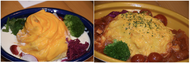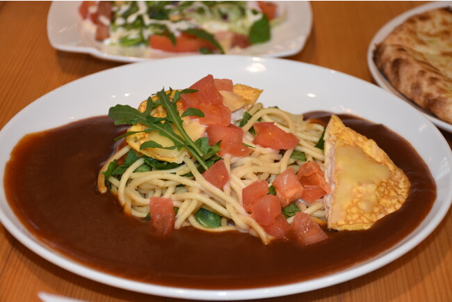 八百屋「一期家一笑」(下地町)はオムライス。「鈴木さんのだるまトマトのふわとろオムライス」(979円)は、ミニトマトを塩とオリーブオイルだけで味付けしたソースを盛り付けています。和風の「らでぃっしゅ屋さんの明太クリームオムライス」(979円)には、ラディッシュを生のまま使い、色味と辛味を生かしています。「だるまトマト農園」は「今年は例年にない暑さで、まだまだ味がのってきてないので、悔しいところですが、12月が過ぎて旬の時期になったら、またおいしくなります。一期家一笑さんにぜひ足を運んで食べてほしい」と話しました。