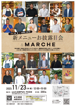 11月23日(木・祝)には、emCAMPUS FOODで今回の新メニューが一堂にそろうお披露目会と農家によるマルシェを開催します。emCAMPUS FOODで現在販売中のチケット(2000円)を購入すると、試食用サイズ5品が食べられます。チケットは先着200綴を用意。当日、来場者が気に入ったメニューに投票し、1位になったグループには賞が贈られます。時間は正午~午後3時です。
